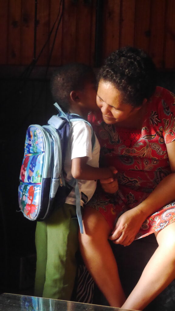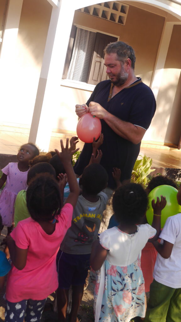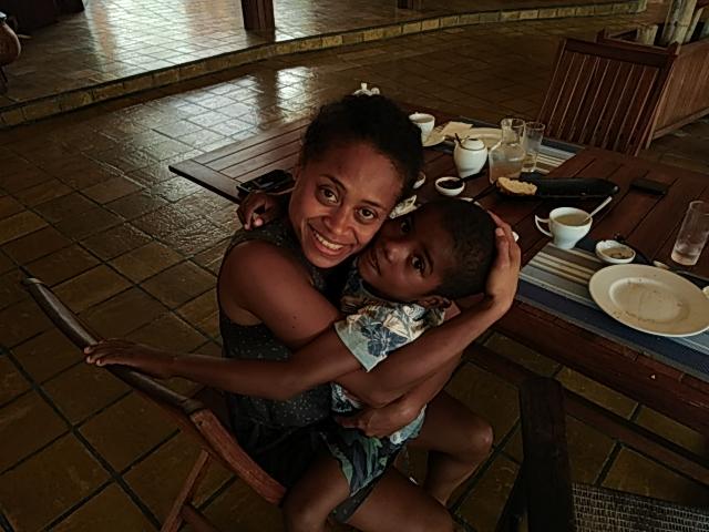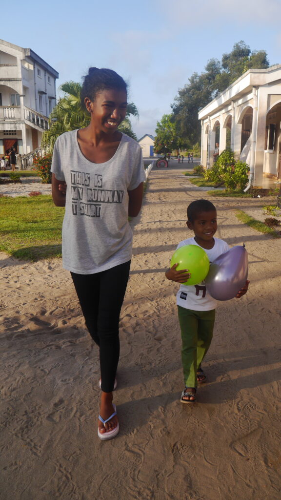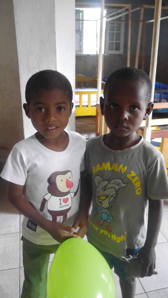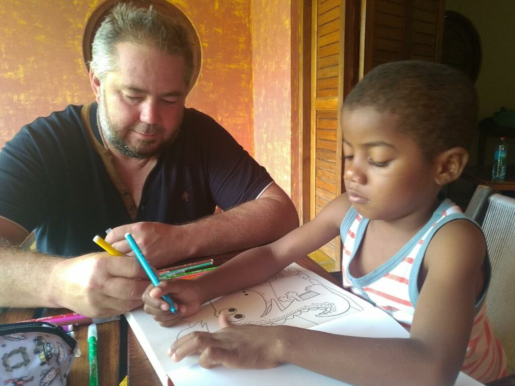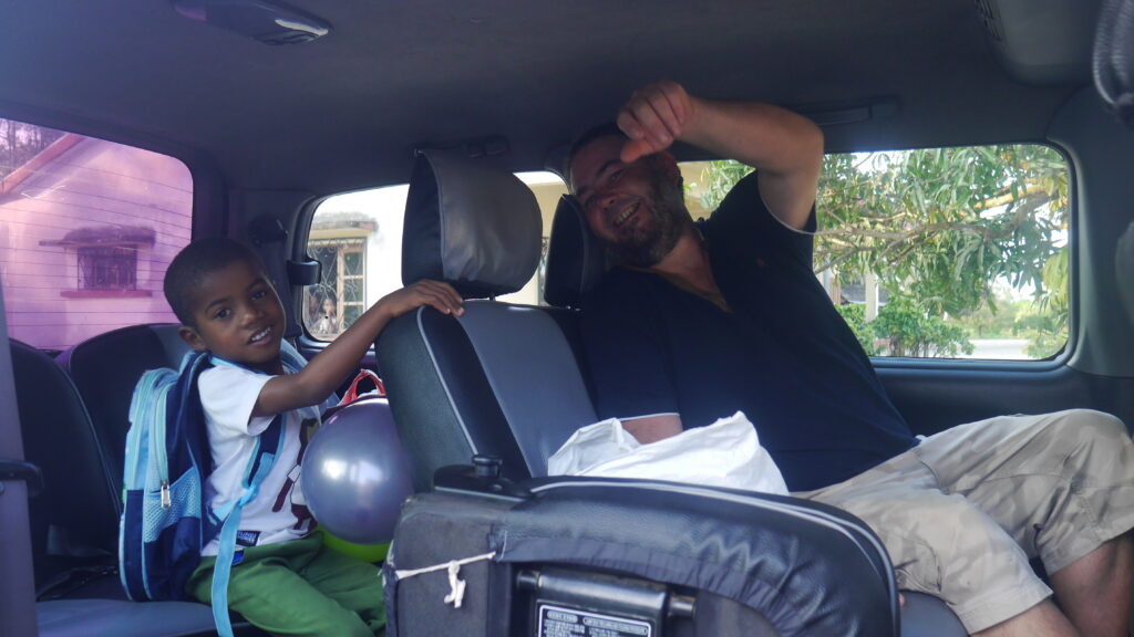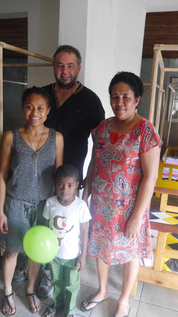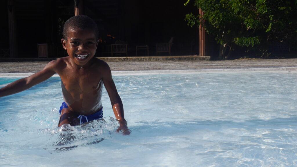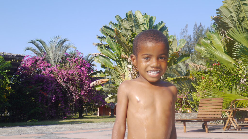 Les premiers jours ont été intenses, nous ne sommes pas trop de deux. Fidérane est plutôt sur le développement d’un enfant de 3, 4 ans, voir moins parfois, demandant une attention continue. Il a besoin de cadre, teste nos limites, il faut aussi dire qu’il est plein de vie cet enfant! Des fois ça déménage sec et cela fait bien rire l’ensemble du personnel de l’hôtel. Il est dégourdi et plein d’humour, un brin malicieux et séducteur avec les gentilles cuisinières qui se montrent complètement gaga. Avec le temps, il prend un peu d’autonomie pour jouer seul. On ritualise beaucoup afin qu’il trouve des repères.
